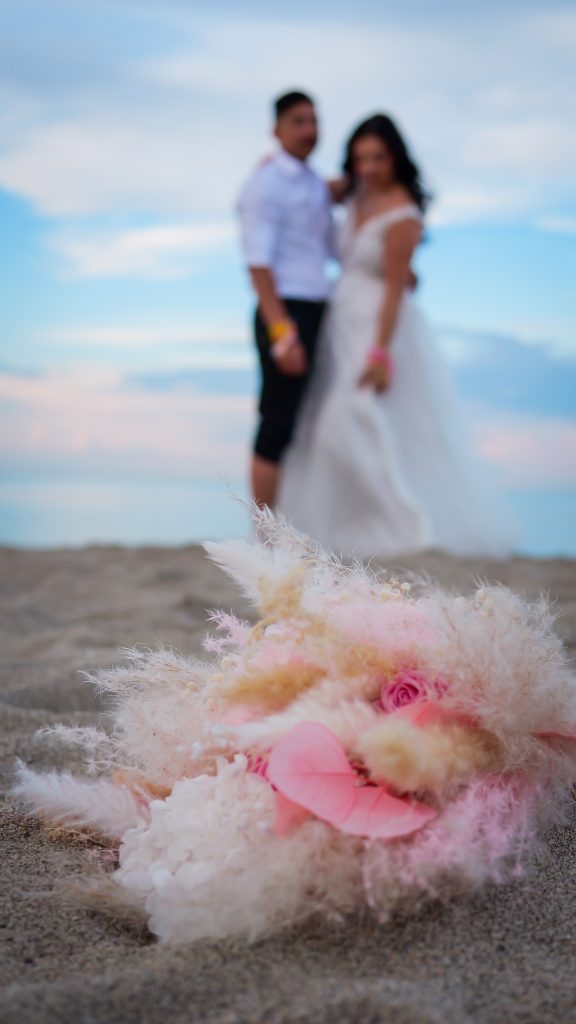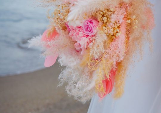 J’ai accompagné Gwendoline et Rémi pour leur mariage traditionnel à Perpignan. Le bouquet de Mariée et la boutonnière ont été réalisés en fleurs séchées et stabilisées afin de voyager sans encombre.